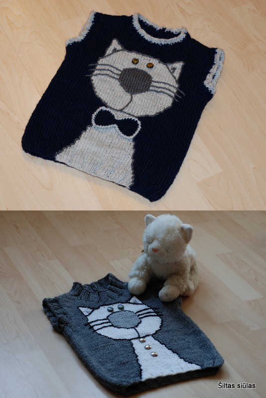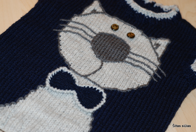 Kelias pastarąsias dienas draugavau su simpatišku katinėliu. Iš pradžių jis gana nedrąsiai ryšėjo mėlyname fone, bet kuo daugiau bendravom, tuo mielesnis ir išraiškingesnis jis darėsi. Zylutės pakuždėjo, kad šis murklys tikriausiai keliaus po kalėdine eglute, kad nustebintų mažą berniuką. Todėl mes su katinėliu ilgai tarėmės, kaip čia pasipuošti: segtis sagutes, rištis mažą kaklaraištį, ar pasidabinti „varlyte“? Ir bendru sutarimu nusprendėme, kad „varlytė“ bus tinkamiausias aksesuaras šventiniam vakarui. Ir žiūri dabar jis į mane… toks visas šventiškas, savimi patenkintas ir be galo mielas. Smagu, kad mezginių galerijoje anksčiau megztas baltas katinėlis turi draugą. Dabar šiems džentelmenams į draugiją trūksta tik mielos dailios katytės… tikros damos… gal juodos raudoname fone, su baltais ilgais ūsais ir perlų karoliukais…?