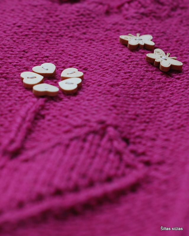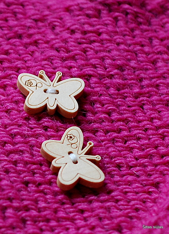 dar laimi. Dažniausiai. O kartais rožinė būna tokia švelni, subtili ir lengva, kad ir mane įsuka į tą švelnumo ir mergaitiškumo verpetą. Šių siūlų kamuoliukas iš pradžių pasirodė gana ryškus, ypač po kelių pastarojo meto rusvų – pilkų mezginių. Bet po truputį tas intensyvumas kažkur „dingo“ ir rankose ėmė pintis tik gražus, nerėžiantis akių šiltas siūlas… O kai galiausiai į savo vietas sutūpė drugeliai, kuriuos nutupdyti į sekantį jos mezginį buvau pažadėjusi dar tada, kai narpliojau širdelių liemenę, spalva tapo tiesiog sodri ir rami. Ir labai tiko tai mažai princesei. Ir kada gi daugiau galima pabūti princese, jei ne dabar…