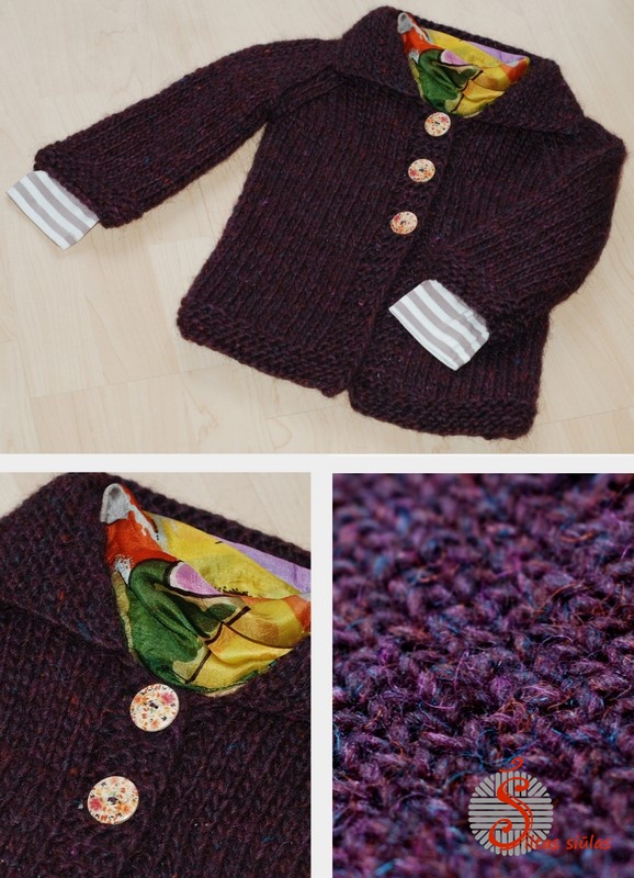 Taigi tiek atsižvelgiant į vilnos savybes, tiek į siūlo storumą, megztinis – švarkelis mergaitei gavosi tikrai labai šiltas. Su tokiu rūbu vaikas jokiame darželyje nesušals ir jokia striukė neatrodys per plona. Rankovių šį kartą tyčia nedariau reikiamo ilgio – pagalvojau, kad stora megztino rankovė apie riešą gali ne visiškai draugiškai sugyventi su aptemptu striukės rankogaliu. Tad tegul vieno rūbo rankovė būna trumpesnė – taip jos nesusitiks pačioje nepatogiausioje vietoje ir išvengs bereikalingo konflikto. O siūlo “šiurkštumas“… Nėra jis labai švelnus, nes visgi tai natūrali vilna, bet mezginį išskalbus, jis labai stipriai pasikeitė į gerąją pusę. Šilkiniu, aišku, netapo, bet pats didysis siūlo aštrumas nusiskalavo ir nubėgo kažkur kartu su tekančiu vandeniu. Rūbas tapo mielas tiek lietimui, tiek dėvėjimui.