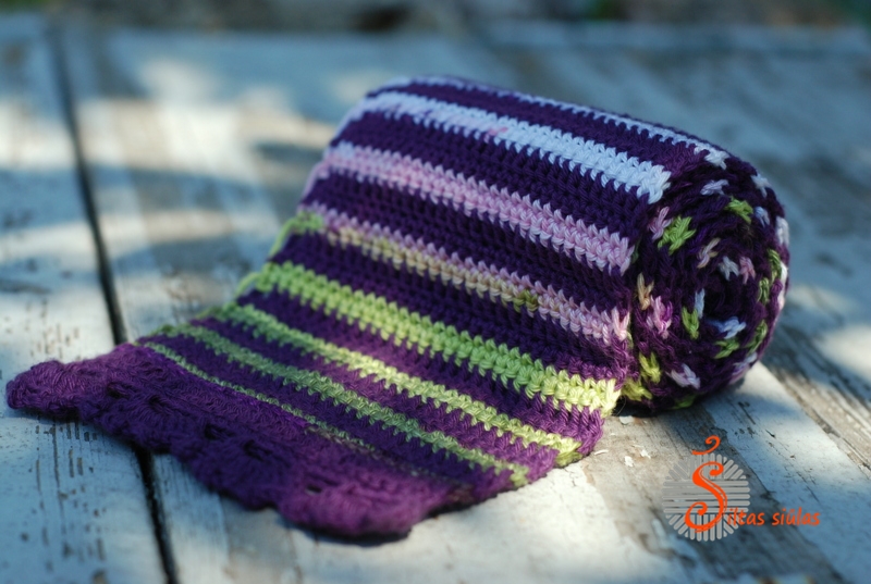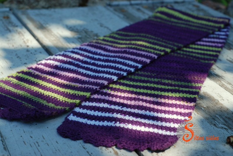 Taigi akys bėgiojo po kamuoliukų dėžę, o galvoje sukosi mintys, ką čia paprasto ir praktiško sugalvojus, kad būtų ką veikti, bet nereiktų pernelyg daug galvoti, skaičiuoti akių ir sekti sudėtingų schemų. Ir visgi kai intensyviai galvoji, mintis anksčiau ar vėliau ateina. Taip gavosi itin paprastas medvilninis šalikėlis rudeniui: viena tamsiai violetine spalva ritmingai vis kartojo tą patį akordą, o kita – linksmai skambėjo visu savo gražumu. Spalvos subtiliai mainėsi viena su kita, akys mėgavosi jų deriniu, o kojų pirštai lengvai glostė kupų smėlį. Aplink buvo jūra, vasara ir atostogos…!